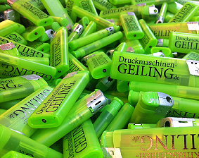 Unter Siebdruck versteht man ein Druckverfahren, bei dem die Farbe mit einer Gummirakel durch ein feines Gewebe auf das zu bedruckende Material – zum Beispiel Feuerzeuge – gedruckt wird. An den Stellen, an denen nicht gedruckt werden soll, wird das Gewebe farbundurchlässig gemacht.