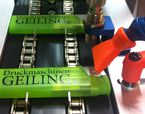 Alle Siebdruck-Maschinen der Firma Geiling verfügen, wenn möglich, über UV-Technik. Das bedeutet, dass der Gegenstand gleich nach dem Bedrucken verpackt werden kann, da die Farbe sofort ausgehärtet ist.